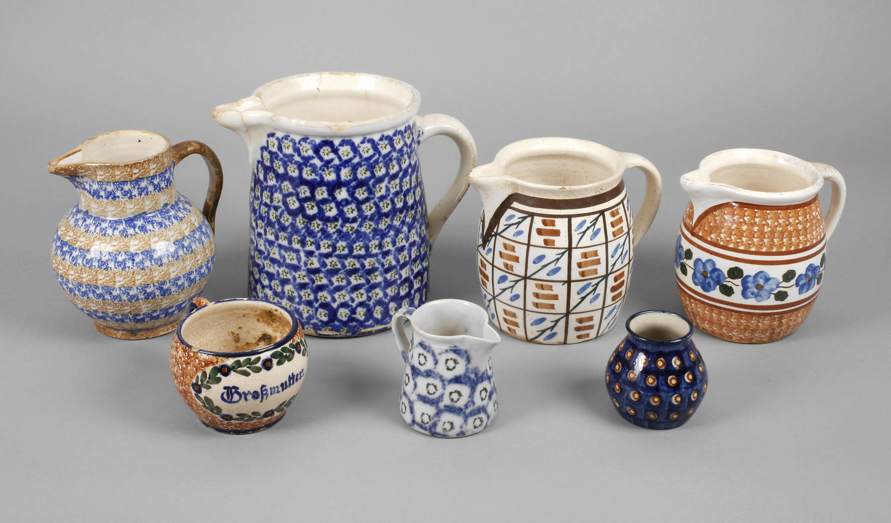 1930er bis 1950er Jahre, einmal Reliefmarke mit Kanne, zwei handschriftlich bezeichnet Neumarkt, hellgrauer Scherben mit verschiedenen geschwämmelten und gepinselten Dekoren, vier Kannen, eine Tasse mit Aufschrift Großmutter und eine kleine Vase, alle mit Gebrauchs- und Altersspuren, H max. 20 cm.