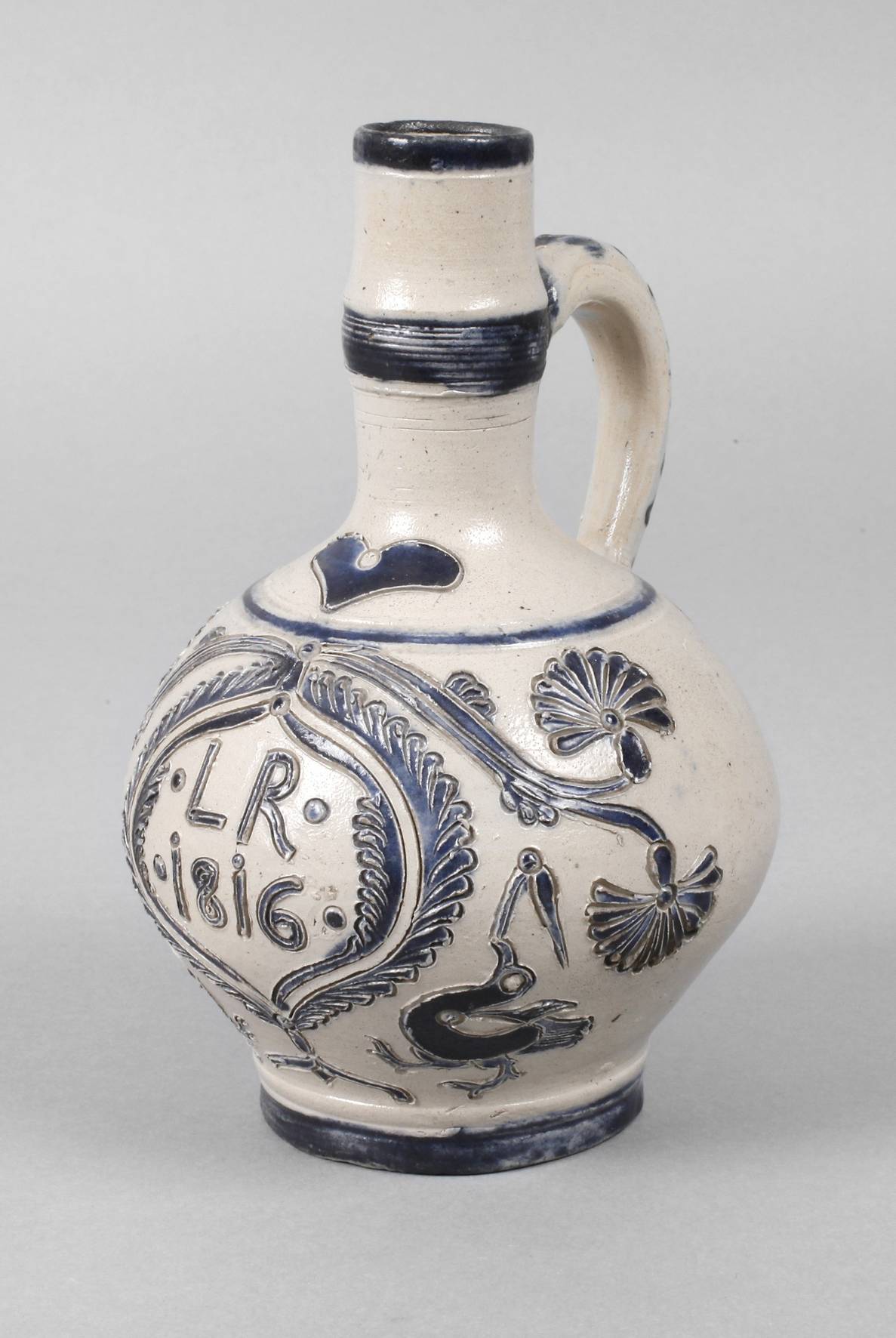 1816, Steinzeug mit Salzglasur, geritzt und kobaltblau ausgemalt, aufwendiger Ritzdekor, mittig im Kranz Initialen ”LR” und die Jahreszahl 1816, aus dem Kranz entspringen Ranken mit fächerförmigen Blättern, flankiert von zwei langhalsigen Vögeln, weitere Blaumalerei rückseitig und umlaufend, altersentsprechend sehr schöner Zustand, H ca. 18 cm.