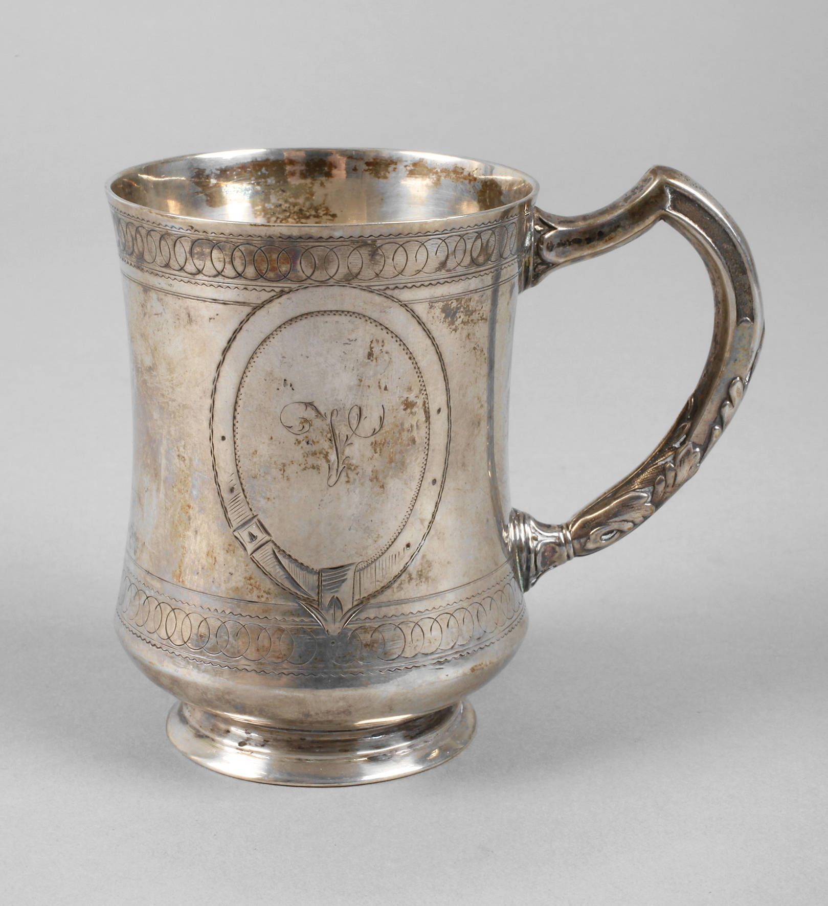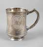 um 1870, gestempelt 800, Herstellermarke Wilhelm Binder/Schwäbisch Gmünd, fein gravierter Becher mit umlaufenden Ornamentbändern und schauseitiger Kartusche als Gürtel, Besitzermonogramm V, der Griff verziert mit Akanthusblättern, innen Reste alter Vergoldung, guter altersgemäßer Zustand, H 8,5 cm, G ca. 86 g.