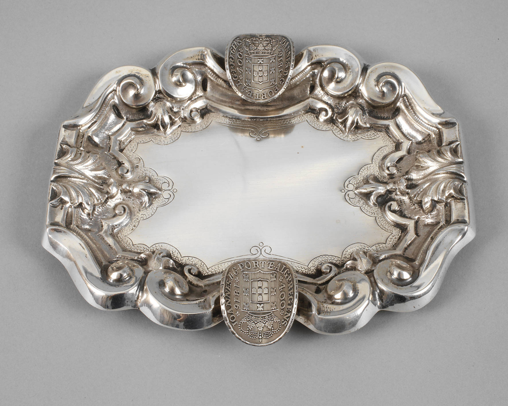 getrieben und ziseliert, Rollwerkdekor und Palmetten, zwei Zigarrenablagen aus gewölbten und einseitigen gegossenen Medaillen zur Krönung von Prinzregent Johann VI. von Portugal zum König von Brasilien, in feinster Erhaltung, Punzierung nicht erkennbar, L 17,5 cm, G ca. 183 g.