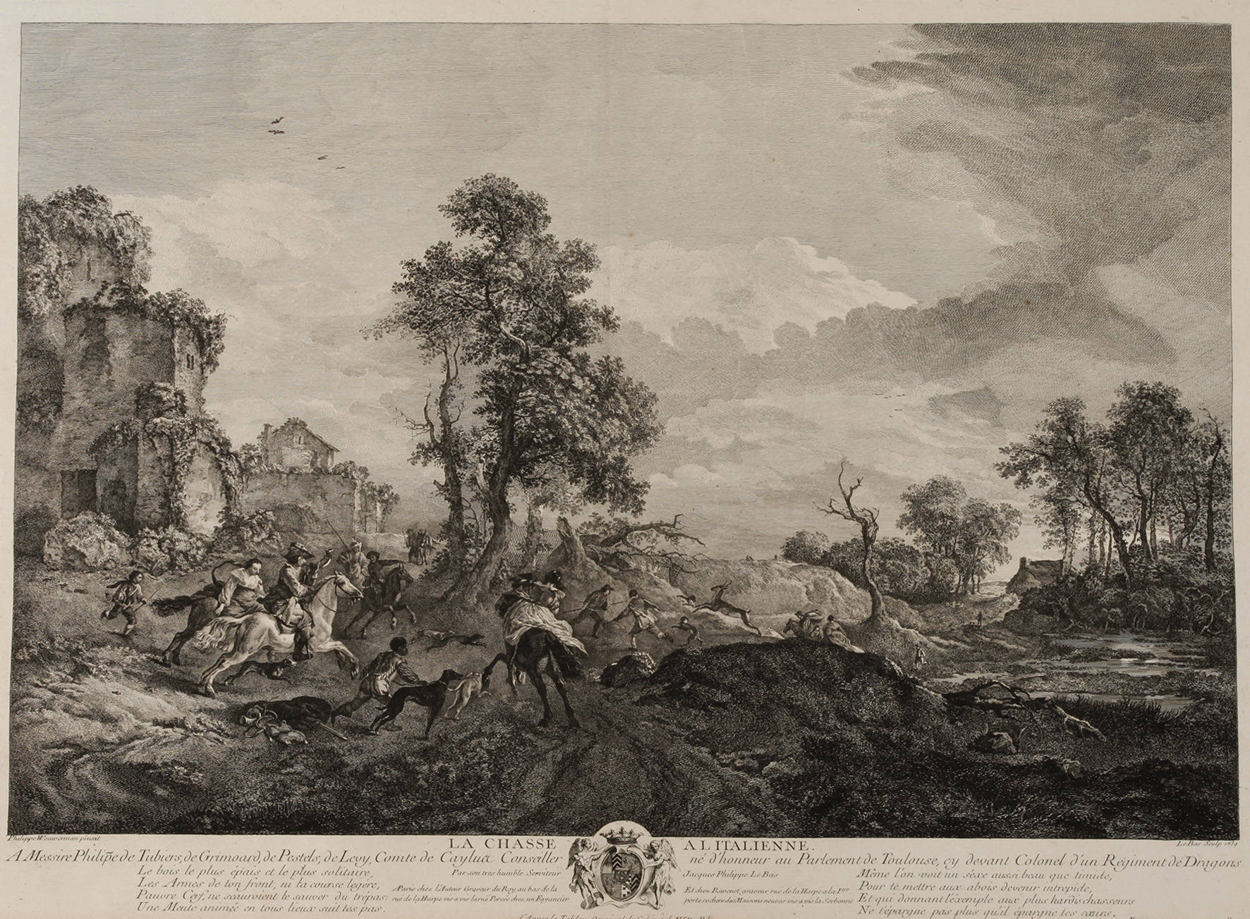 zahlreiche Jäger zu Pferde und das Wild treibende Helfer in hügeliger Landschaft, im linken Bildbereich begrenzen überwucherte Ruinen den Bildausschnitt, unter der Darstellung in der Platte ausführlich bezeichnet, detailreicher, malerisch wirkender Kupferstich nach einer Vorlage von Philippe Wouwerman, in der Platte rechts signiert und datiert „LeBas Sculp 1739“ und „Philippe Wouwerman pinxit“, mittig Faltlinie, lichtrandig, teils gebräunt, ungerahmt, Darstellungsmaß ohne Schrift ca. 41,2 x 60 cm, Blattmaß ca. 60 x 79 cm. Künstlerinfo: frz. Kupferstecher (1707 bis 1783 Paris), Schüler von Antoine Hérisset, ab 1771 Mitglied der Académie royal, 1782 von Louis XV. zum Königlichen Graveur ernannt, fertigte ca. 500 Stiche nach verschieden Meistern, so ca. 100 Arbeiten nach David Teniers, Quelle: Wikipedia.