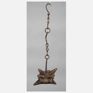 frühe Neuzeit, ungemarkt, Schmiedeeisen, mehrteilig gefertigt und geschwärzt, an zierlicher Gliederkette abgehängte sternförmige Schale, starke Altersspuren, H 30 cm.