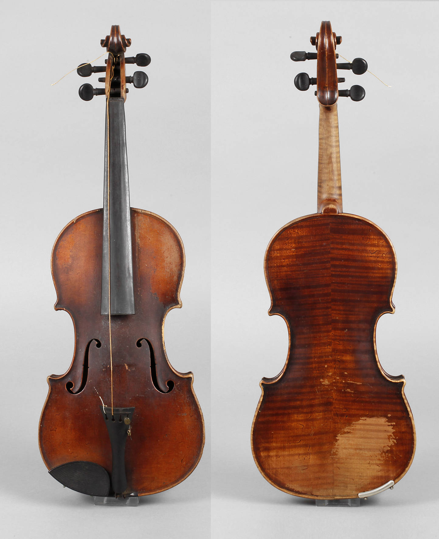 Anfang 20. Jh., mit Modellzettel Antonius Stradivarius Cremonensis, geteilter, gleichmäßig geflammter Boden in dunkelbraunem Lack, dreiteilige, umlaufende Randeinlage, Decke mit verfestigter Rissbildung, starke Alters- und Gebrauchsspuren, mit defektem Bogen, im Etui, L Korpus 35,4 cm.