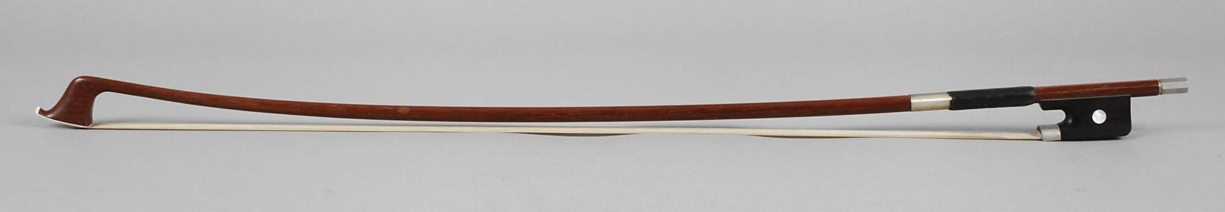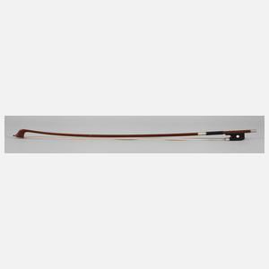 Anfang 20. Jh., signiert Artist, teils facettiertes Griffstück aus Tropenholz, mit Silberdrahtwicklung und Ledermanschette, Frosch aus Ebenholz mit eingesetztem Auge aus Perlmutt, Zierelemente aus Nickel, Gebrauchsspuren, Gewicht 75,9 g, L 67,2 cm.