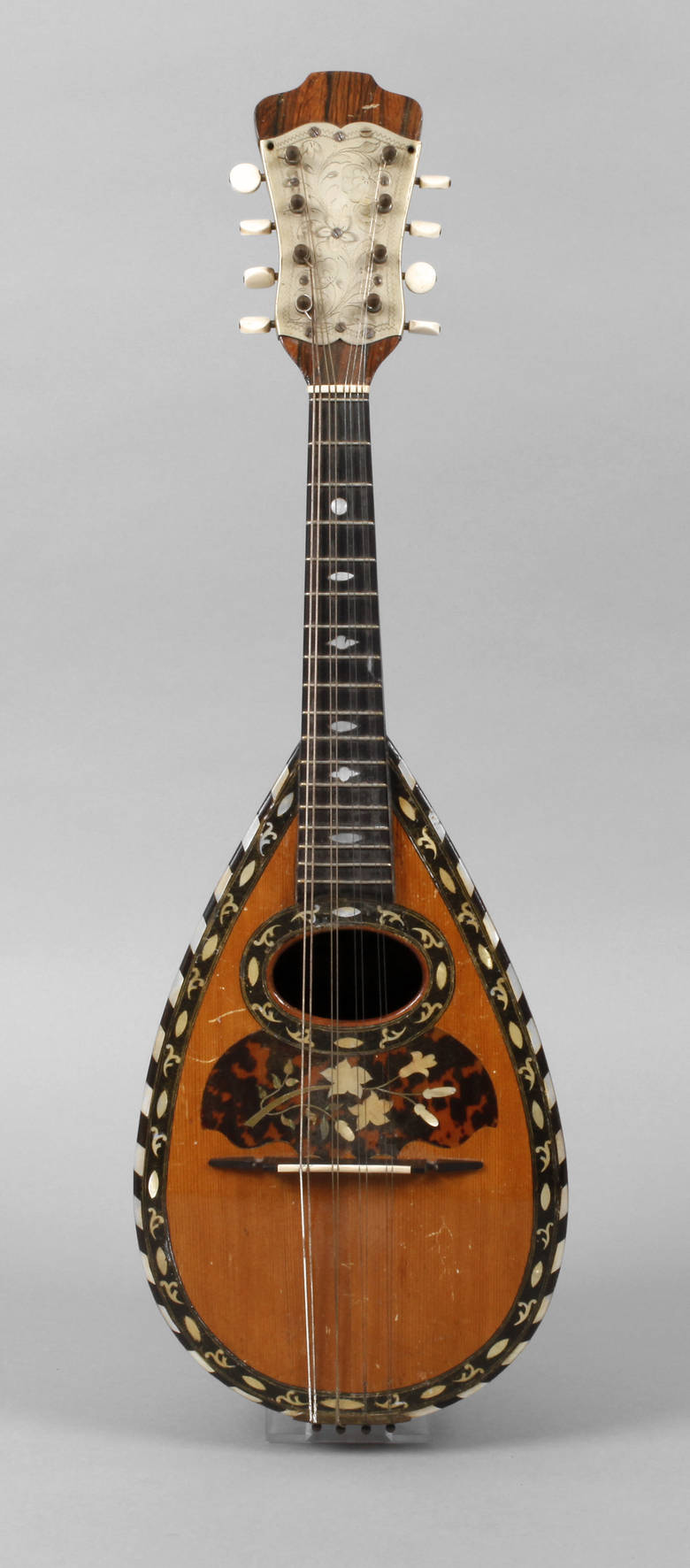 um 1930, mit Klebezettel F. Puglise Aloisio Catania (Sicilia), aufwendig gearbeiteter Boden, fächerartig profiliert, in dunklem Wurzelholz, die Decke aufwendig verziert mit Ornamentbändern, das Schallloch mit Verzierungen aus Perlmutt und Schildpatt, Alters- und Gebrauchsspuren, L 60 cm.