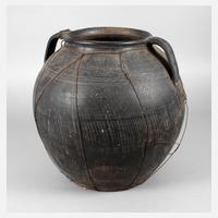 ungedeutetes Alter, zweihenkeliges, kugelbauchiges Gefäß, Bandhenkel mit je zwei Fingerkniffen angedrückt, eingeglättete Schraffur-Verzierung, geschmauchte Ware, am Übergang zum Schulterbereich Wellenlinien zum Kaschieren des angesetzten Oberteils, mit einem Netz aus Eisendraht umgeben, Alters- und Gebrauchsspuren, Bodenbereich rissig, H ca. 36 cm, D Bauch ca. 37,5 cm, D Mündung ca. 22 cm. Provenienz: Aus der Sammlung des vogtländischen Heimatforschers und Schriftstellers Gottfried Doehler (1863 in Kleingera bis 1943 in Greiz), dieser war ab 1921 Leiter der Kupferstichsammlung im Sommerpalais Greiz, nach dem Tod seiner Frau Luise Doehler in den 1970 Jahren erworben.