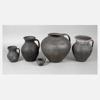 wohl Kanarische Inseln, Ende 19. Jh., geschmauchte Irdenware, verschiedene bauchige Henkelgefäße, altersgemäßer guter Zustand, H max. 30 cm. Provenienz: Aus der Sammlung des vogtländischen Heimatforschers und Schriftstellers Gottfried Doehler (1863 in Kleingera bis 1943 in Greiz), dieser war ab 1921 Leiter der Kupferstichsammlung im Sommerpalais Greiz, nach dem Tod seiner Frau Luise Doehler in den 1970 Jahren erworben.