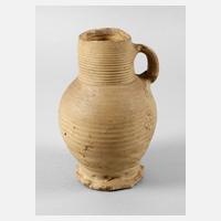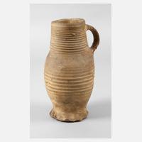15. Jh., Ton handgearbeitet, gedrückter Stand, weiche Drehrillen, abgeflachte Mündung, angesetzter Henkel mit Rille, minimal bestoßen, H 19 cm.