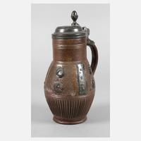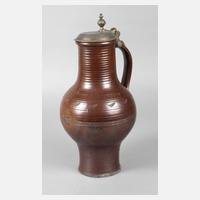 18. Jh., graues Steinzeug handabgedreht, dunkelbraun engobiert, verziert mit reliefierten und geritzten Bändern sowie umlaufende Häkchenmotive, originaler Zinndeckel (ungepunzt), mit schlankem Kugeldrücker, Zinnstandring fehlt, geringe Herstellungsmängel und ein unbedeutender Oberflächenchip am Stand, H 37 cm.