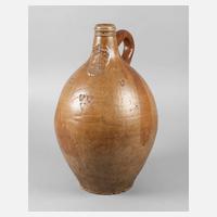 um 1700, graues Steinzeug handabgedreht, gesprenkelte braune Glasur, gebauchter Krug mit reliefiertem Bartmannsgesicht am Ausguss, weitere gestempelte dreieckige Verzierungen, herstellungsbedingt kleine Dellen, Glasurfehlstellen und Brandrisse, Henkel restauriert, am Stand minimal bestoßen, H 45 cm.