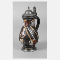 um 1880, geritzte Marke MF, zwei ungedeutete Punzen, guter Zustandrötlicher Scherben mit weißer Craqueléglasur, in bunten Muffelfarben bemalt, mittelalterliche Zecherszene zwischen Bäumen, Montur bestehend aus Zinnstandring und übergreifendem Deckel mit Weinrankendekor, H 25 cm.