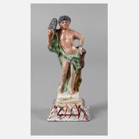 wohl Wiersbie (Schlesien), um 1775 bis 1783, kobaltblaue Pinselmarke ”W”, hellgrauer Fayencescherben, bemalt mit bunten Scharffeuerfarben, in Pose, mit Stein auf einem quadratischen Sockel stehender Mann, kleine Glasurfehlstellen, restauriert, H 13,5 cm.