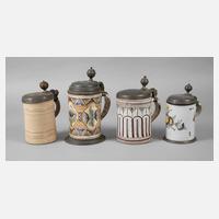 2. Hälfte 18. Jh. und 1. Hälfte 19. Jh., Fayencescherben mit weißlicher Glasur und bunter Scharffeuerfarbenbemalung, dazu ein Krug aus cremefarben eingefärbtem Steinzeug, mit Rillenbändern verziert, alle mit Zinndeckeln, zwei mit Zinnstandring, alle mit Haarrissen, beschädigt oder geklebt, H max. 25 cm.