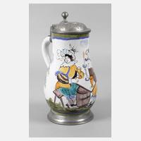 Ende 18. Jh., leicht rötlicher Fayencescherben, manganfarben geschwämmelt auf weißem Grund, mit bunten Scharffeuerfarben bemalt, schauseitig Kartusche mit einem über einen Zaun springenden Pferd, Zinnmontur bestehend aus durchgebödetem Standfuß, hohem Lippenrand und übergreifendem Deckel mit großer Kugelrast, eingelegt ein Medaillon mit ackerndem Bauer und Tieren in Landschaft, graviertes Besitzermonogramm A.R.SK.1813., kleinere Glasurfehlstellen, die Wandung mit einem in Zinn reparierten Loch, Lippenrand locker, H 26 cm.
