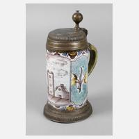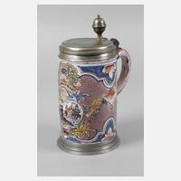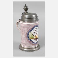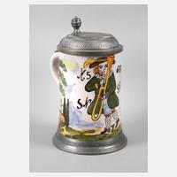 um 1880, monogrammiert KW, leicht rötlicher Fayencescherben mit weißer Craqueléglasur, in bunten Muffelfarben bemalt, Posaunist in südländischer Landschaft mit Gebäude, Bäumen und Bergen, Montur bestehend aus Zinnstandring und übergreifendem Deckel, dieser mit gepunztem Wappen, guter Zustand, H 18,5 cm.