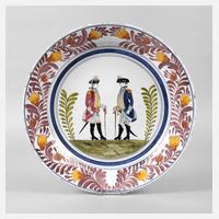 wohl 2. Hälfte 18. Jh., ungedeutete Marke G.B.S., grauer Fayencescherben weiß glasiert, bemalt mit bunten Scharffeuerfarben, im Spiegel zwei Offiziere mit Säbeln stehend, auf der Fahne Blütenranken, Alterscraquelé und Glasurfehlstellen, D 43 cm.