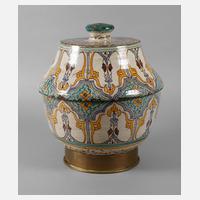 wohl 18. Jh., gelblicher Scherben mit cremefarbener Craqueléglasur, bauchiges Gefäß mit übergreifendem Deckel, bemalt mit bunten Scharffeuerfarben, ornamentaler Dekor, später angebrachter Messingstandring, eventuell Italien, altersgemäß an den Kanten und an der Wandung leichte Bestoßungen und Glasurfehlstellen, H 38 cm.