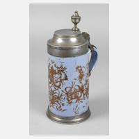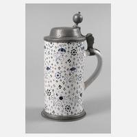 um 1840, am Boden undeutlich geritzt, rötlicher Fayencescherben hellblau glasiert, Reste rotbrauner Kaltmalerei, Zinnmontierung bestehend aus Standring, Lippenrand und übergreifendem Deckel, dieser mit urnenförmigem Drücker und umlaufenden Perlbändern, graviertes Besitzermonogramm M.R.F. sowie kleine Blüten, am Henkel unten alte Zinnreparatur, H 25 cm.