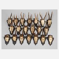 Mitte 20. Jh., teils datiert, 20 Stück, Rehgehörne, auf geschwärzten Holzplatten montiert, L max. ca. 35 cm.