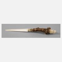 um 1880, ungemarkt, Hirschhorn aufwendig beschnitzt, von plastischem Jagdhundhaupt verziertes Griffstück mit Ziermanschette aus Akanthusblättern, eingesetzte Klinge ebenfalls aus Bein, min. trocknungsrissig, L 23 cm.