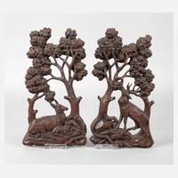 wohl süddeutsch, Ende 19. Jh., Nussbaum geschnitzt und dunkelbraun gebeizt, Zierreliefs mit Darstellung eines äsenden Zehnenders, bzw. ruhender Ricke mit ihrem Jungen, kleine Fehlstelle, H je 29 cm.