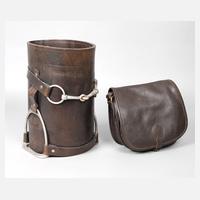 20. Jh., aus braunem Glattleder gefertigt, Schirmständer mit Kunststoffeinsatz und Applikationen aus Weißmetall in Form zweier Steigbügel und einer Wassertrense, Tasche unterteilt in zwei Fächer, eines getrennt schließbar, H Ständer 32 cm.