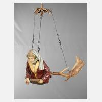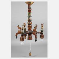 um 1920, ungemarkt, Holz gedrechselt und geschnitzt, polychrom gefasst und in Bauernmalerei verziert, Balusterschaft mit drei Leuchterarmen und vier abgehängten Lampenfassungen, dekoriert mit aufgesteckten vollplastischen, figürlichen Schnitzereien, H ca. 75 cm, D ca. 50 cm.