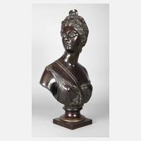 Mitte 19. Jh., an der Plinthe signiert, Bronze ziseliert und nuanciert braun und grünlich patiniert, Brustdarstellung der Diana in an der Schulter gefasstem Gewand mit elegantem Faltenwurf, mit zur Seite gedrehtem, von einem Halbmond bekröntem Haupt, partiell leicht berieben, sonst gute altersgerechte Erhaltung, H 62 cm. Künstlerinfo: französischer Bildhauer (1741 Versailles bis 1828 Paris), Schüler von Pigalle und Lemoyne an der Academie Royal, 1761 Aufnahme an der Élèves Protégés, Aufenthalte in Frankreich, Deutschland, Russland und Italien, erfolgreichster Portraitbildhauer seiner Zeit, Carl August oder auch Anna Amalia von Braunschweig-Wolfenbüttel sowie Goethe statteten ihre Schlösser mit seinen Werken aus, heute stehen Werke in bedeutenden Museen wie dem Louvre/Paris, dem Liebighaus/Frankfurt am Main, dem Bode-Museum/Berlin, dem Herzoglichen Museum Gotha sowie der Eremitage in Sankt Petersburg. Quelle: Internet.