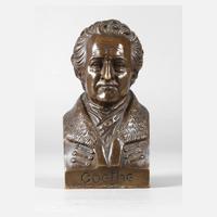 datiert 1851 und signiert, Gießerstempel Rolland Fondeur Paris und Stempel Bronze Garanti Au Titre A.L., weitere unleserliche gestempelt Buchstaben, recto bezeichnet Goethe, Bronze ziseliert und hell grünlich-braun patiniert, Brustdarstellung des deutschen Dichters und Naturforschers Johann Wolfgang von Goethe im Pelzmantel, gute Erhaltung, H gesamt 13 cm. Künstlerinfo: französischer Bildhauer und Medailleur (1794–1866), studierte 1814 an der Pariser Kunstakademie, stellte ab 1819 im Salon aus, 1924 Übersiedlung nach Spanien, wo er später im Auftrag der Regierung eine Skulptur König Ferdinands VII. schuf, 1848 Rückkehr nach Paris, fertigte vorwiegend Portraitbüsten, Bekanntheit erlangte er durch die Darstellung Kardinal Talleyrand Perigords, 1839 vollendete er die für das Stadthaus zu Paris bestimmte Statue des Bildhauers Jean Goujon. Quelle: Internet.