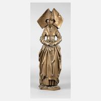 Ende 19. Jh., unsigniert, Gießereistempel Pirner & Franz Dresden, verso teils unleserlich bezeichnet ”VIII Michelle de France...”, Info Michelle de Valois: 1395 Paris bis 1422 Gent, war die Gemahlin von Graf Philipp von Charolais und somit Herzogin von Burgund, sie leitete die Regierungsgeschäfte in Flandern und Artois, Darstellung in langem Kleid und mit Haube, die Hände vor dem Bauch verschränkt, auf unregelmäßiger, hexagonal facettierter Plinthe, Altersspuren und Grünspan, verso etwas zerkratzt, H gesamt 58 cm. Quelle: Internet.