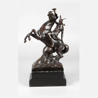 um 1900, auf der Plinthe signiert, Bronze dunkel patiniert, Darstellung einer kämpferischen Amazone als Halbakt, mit geflügeltem Helm und mit hoch erhobener Axt auf dem nackten Rücken eines steigenden Pferdes, auf naturalistisch gestalteter Plinthe, auf mehrteiligem schwarzen Marmorsockel mit eingelegtem, grün marmoriertem Band, Sockel minimal bestoßen, sonst lediglich geringe Altersspuren, H Bronze 35 cm, H gesamt 45 cm. Künstlerinfo: Berliner Bildhauer (1875 Fürstenwalde bis 1931 Berlin), lernte an der Berliner Akademie unter Ludwig Manzel, wirkte freischaffend als Künstler in Charlottenburg, beschickte 1904–1918 regelmäßig die Große Berliner Kunstausstellung, schuf überwiegend vom Jugendstil geprägte Kleinplastiken. Quelle: Thieme-Becker und Internet.