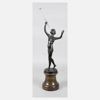 Mitte 19. Jh., unsigniert, Bronze dunkel braun-grün patiniert, Aktdarstellung des Gottes Dionysos mit passenden Attributen, wie dem über die Schulter geworfenen Ziegenfell (Nebris) und mit Rebensprossen bekränztem Haupt, an den Füßen reich verzierte geschnürte Sandalen, die Haltung lässt sich mit dem rechts zu ergänzenden Panther erklären, welcher das wichtigste Begleittier des Dionysos darstellt, der Name ”Narziss von Pompeji” leitet sich aus dem Irrglauben ab, der Jüngling mit dem gesenkten Kopf würde sein Spiegelbild im Wasser betrachten, die in Pompeji gefundene flavische Originalskulptur, die nach hellenistischem Vorbild geschaffen wurde, befindet sind im Museo Archeologico Nazionale in Neapel, auf ornamental verzierter, gekehlter, runder Plinthe, gute Erhaltung, qualitätsvoller Guss, H gesamt 48,5 cm. Quelle: Le collezioni del Museo Nazionale Archeologico Napoli (1989) und Internet.