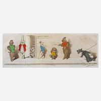 Reihe von Hunden, die sich zum Pinkeln an einem Baum anstellen, überrascht, als eine Katze sich mit anstellt, kolorierte Radierung, um 1930, unter der Darstellung rechts in Blei signiert, und links unleserlich betitelt, leichte Erhaltungsmängel, unter Passepartout in rahmenlosem Bilderträger, Darstellungsmaß ca. 16 x 43,5 cm. Künstlerinfo: schottisch-amerikanischer Maler und Graphiker (geboren 1882 in Glasgow) Studium in Paris, vorwiegend als Aquarellist tätig, war ansässig in Pittsburgh, Quelle: Vollmer.