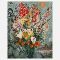prächtiges Blumenbukett in Vase, vor Phantasielandschaft mit Esel und schwebendem Liebespaar, farbenfrohe Farblithographie auf langfaserigem Papier, um 1970, unter der Darstellung rechts Signaturstempel Marc Chagall und links in blei nummeriert 2/250, unter Passepartout und hinter Glas gerahmt, Darstellungsmaß ca. 69,8 x 57,5 cm. Künstlerinfo: bürgerlich Moishe Zakharovich Shagalov, bedeutender russisch-frz. Maler, Graphiker und Bildhauer jüdischer Herkunft (1887 Liosno/Witebsk bis 1985 Paul de Vence), Schüler des Malers Jehuda Pen, 1907 an der Kaiserlichen Gesellschaft zur Förderung der Künste St. Petersburg, 1908 Privatschule Saidenberg und bei Léon Bakst an der Swansewa-Schule, ab 1910 eigenes Atelier in Paris, Pionier des Surrealismus, berühmt für seinen mystischen Symbolismus, tätig unter anderem in Petersburg, Paris, Montrouge, USA, Quelle: Vollmer, Wikipedia und Internet.