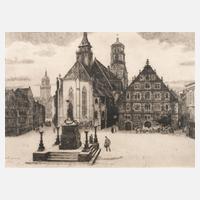 seitlicher Blick von der Alten Kanzlei auf das von Bertel Thorvaldsen erschaffene Schillerdenkmal, im Hintergrund befindet sich die Stiftskirche, nuancenreiche, in braun gedruckte Radierung, links unten in der Platte signiert und datiert A. Eckener 1943, außerhalb der Darstellung etwas knitterspurig, hinter Glas gerahmt, Darstellungsmaß ca. 27,8 x 38,5 cm, Falzmaß ca. 48,5 x 58 cm. Künstlerinfo: genannt Alex E., dt. Maler und Graphiker (1870 Flensburg bis 1944 Abtsgmünd/Aalen), jüngerer Bruder des Luftfahrtpioniers Dr. Hugo Eckener, Schüler von Jacob Nöbbe in Flensburg, studierte 1889-93 an der Münchner Akademie bei Herterich, Raab und Wagner, Mitglied der Künstlerkolonie Ekens und ab 1899-1904 Meisterschüler an der Akademie Stuttgart bei Leopold Graf von Kalckreuth, ab 1908 Lehrer und ab 1912 Professor sowie 1925-28 Rektor der Stuttgarter Akademie, Mitglied im Deutschen Künstlerbund Weimar, im Stuttgarter Künstlerbund und der Schleswig-Holsteinischen Künstlergenossenschaft, tätig in Stuttgart, Quelle: Thieme-Becker, Vollmer, Dressler, Matrikel der Akademie München und Internet.