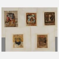 fünf Blatt, abstrakte Kompositionen, entstanden zwischen 1969 bis 1973, jeweils unter der Darstellung signiert, betitelt und datiert, unterschiedliche Erhaltungen, vier Blatt ungerahmt, ein Blatt in rahmenlosem Bildträger, Darstellungsmaß max. ca. 39,5 x 29,5 cm, Blattmaß ca. 58 x 42 cm.