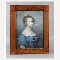 Rahmen aus ca. 7,5 cm breiter, schlicht profilierter Eichenleiste mit quadrierten Ecken, Eckverbindungen geblattet, original beigefügt Kunstdruck einer jungen Biedermeierdame mit gekröntem Haupt hinter Glas als Zugabe, Falzmaß ca. 55 x 41,5 cm.
