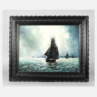 Rahmen aus zur Mitte hin ansteigend profilierter, partiell mit Blattdekor beschnitzter, ebonisierter Holzleiste, Gehrungen geschnitten, Altersspuren, Ölgemälde einer mit ”LR.” monogrammierten, nächtlichen Seelandschaft mit Segelbooten als Beigabe, Falzmaß ca. 51 x 65 cm.