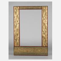 Anfang 20. Jh., aus vorkonfektionierten, mahagonifarben lackierten Bilderleisten zusammengesetzt, diese mit vergoldeten Stuckelementen belegt, hierauf musizierende und tanzende Frauen, verwobene Pflanzenornamente und ruhende Frauen unter Blätterdach, Messingapplikationen, Altersspuren, Falzmaß ca. 40,5 x 25,3 cm.