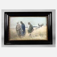 Rahmen aus ca. 7,5 cm breiter, steigend profilierter und schwarz gelackter Holzleiste mit schmalem gestuckten Goldinlay, Gehrungen geschnitten, original beigefügt Kunstdruck mit Darstellung von Jesus Christus, mit seinen Jüngern im Kornfeld, nach einem Gemälde von Johannes Raphael Wehle hinter Glas als Beigabe, geringe Altersspuren, Falzmaß 38,5 x 61 cm.