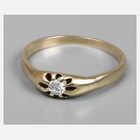 Mitte 20. Jh., Gelbgold gestempelt 585, sich zum 5 mm hohem Ringkopf leicht verbreiternde Schiene, besetzt mit einem Brillant von ca. 0,1 ct, minimale Tragespuren, RW 18 mm, G ca. 2,1 g.