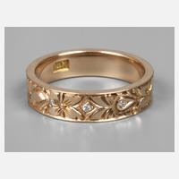 um 2000, Roségold gestempelt 14 k = 585/1000, ca. 6 mm breiter, umlaufend gravierter Bandring, besetzt mit drei kleinen Brillanten, ungetragen, RW 19,5 mm, G ca. 7,8 g.
