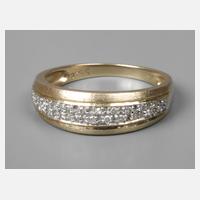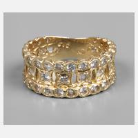 um 2000, Gelbgold gestempelt 375, sich leicht verbreiternde Ringschiene, besetzt mit 21 Achtkantdiamanten in Pavéfassung, leichte Tragespuren, RW 18 mm, G ca. 2,4 g.