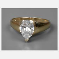 um 2000, Gelbgold geprüft 585/1000, ca. 11 mm hoher Ringkopf, besetzt mit tropfenförmigem, facettiertem synthetischen Zirkonia in Krappenfassung, minimale Tragespuren, RW 19 mm, G ca. 3,8 g.