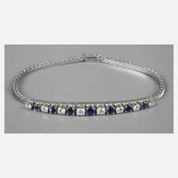 Ende 20. Jh., Weißgold gestempelt 750, gedrückte Fuchsschwanzkette, schauseitig besetzt mit sieben intensiv blauen facettierten Saphiren von max. 0,25 ct sowie acht Brillanten von max. 0,2 ct, im Gesamtgewicht von 1 ct von guter Qualität, verdecktes Kastenschloss mit einer Sicherheitsacht, L ca. 18 cm, G ca. 17 g.