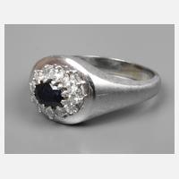 2. Hälfte 20. Jh., Weißgold gestempelt 750, sich zum ca. 11 mm hohen Ringkopf verbreiternde Schiene, besetzt mit intensiv blauem facettierten Saphir von ca. 0,71 ct, umgeben von elf Brillanten von zusammen ca. 0,25 ct in Krappenfassung, leichte Tragespuren, RW 17 mm, G ca. 7,8 g.