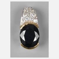 neuzeitlich, sich leicht verbreiternde Ringschiene, besetzt mit oval facettiertem Saphir in Krappenfassung, flankiert von zwölf Saphircarrees in Tunnelfassung und zwölf Achtkantdiamanten in Pavéfassung, RW 19 mm, G ca. 4 g.