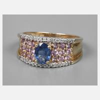 um 2000, Weiß- und Gelbgold gestempelt 585, sich zum 10 mm hohen Ringkopf verbreiternde Schiene, besetzt mit oval facettiertem blauen Saphir, 18 pinken Saphiren und 30 Achtkantdiamanten, minimale Tragespuren, RW 19 mm, G ca. 4,7 g.