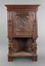 wohl Mitte 17. Jh., Eiche massiv, braun gebeizt, eintüriger Korpus mit fein geschnitzter Front, Kassettenfüllung mit Darstellung der Flucht aus Ägypten, die Lisenen ebenfalls kassettiert und floral geschnitzt, getragen von zwei halbplastischen Karyatiden, alt restauriert, mit späteren Ergänzungen, mit Schlüssel , H 171 x B 103 x T 55 cm.
