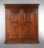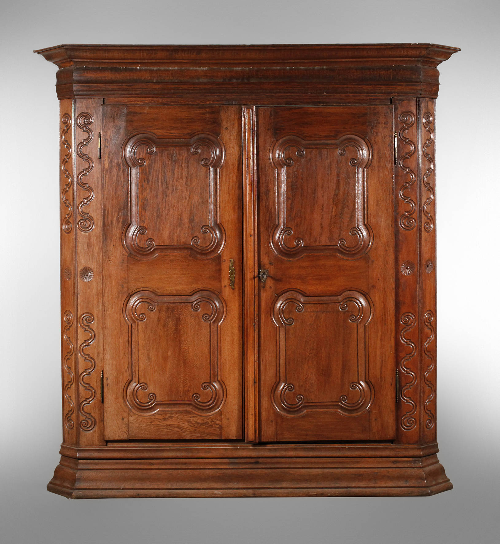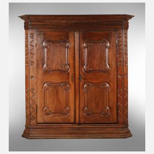 Eiche massiv, 2. Hälfte 18. Jh., komplett zerlegbarer zweitüriger Schrank, reich mit Schnitzereien verziert, aufwendig gearbeitetes Profilgesims, innen mit originalem Einlegeboden, alt restauriert, Maße H 205 x B 196 x T 67 cm.